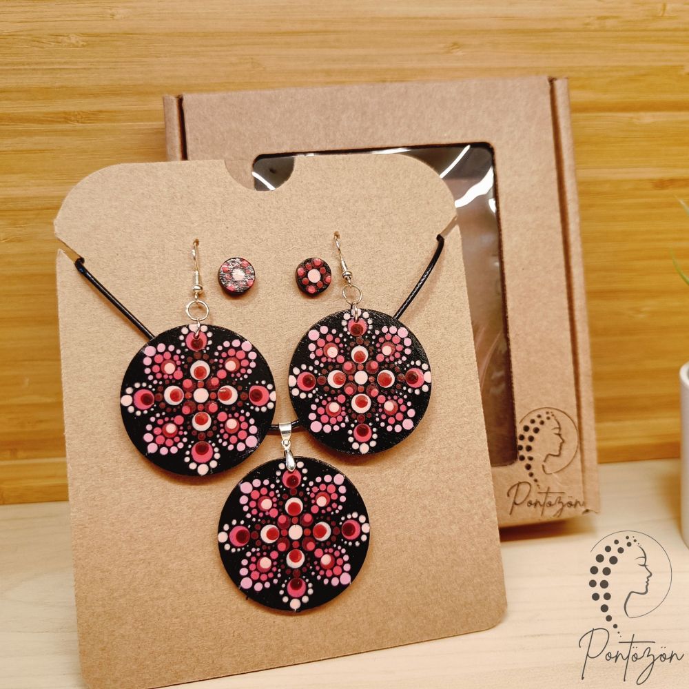 Egyedileg készített egyoldaú fülbevaló, kis méretű fülbevaló és nyaklánc szett bordó és rózsaszín árnyalatokkal.