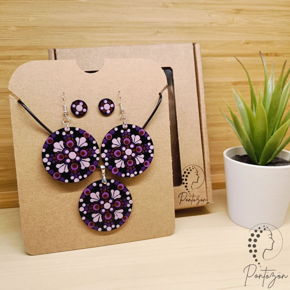 Egyedileg készített egyoldaú fülbevaló, kis méretű fülbevaló és nyaklánc szett lila és levendula színekkel.