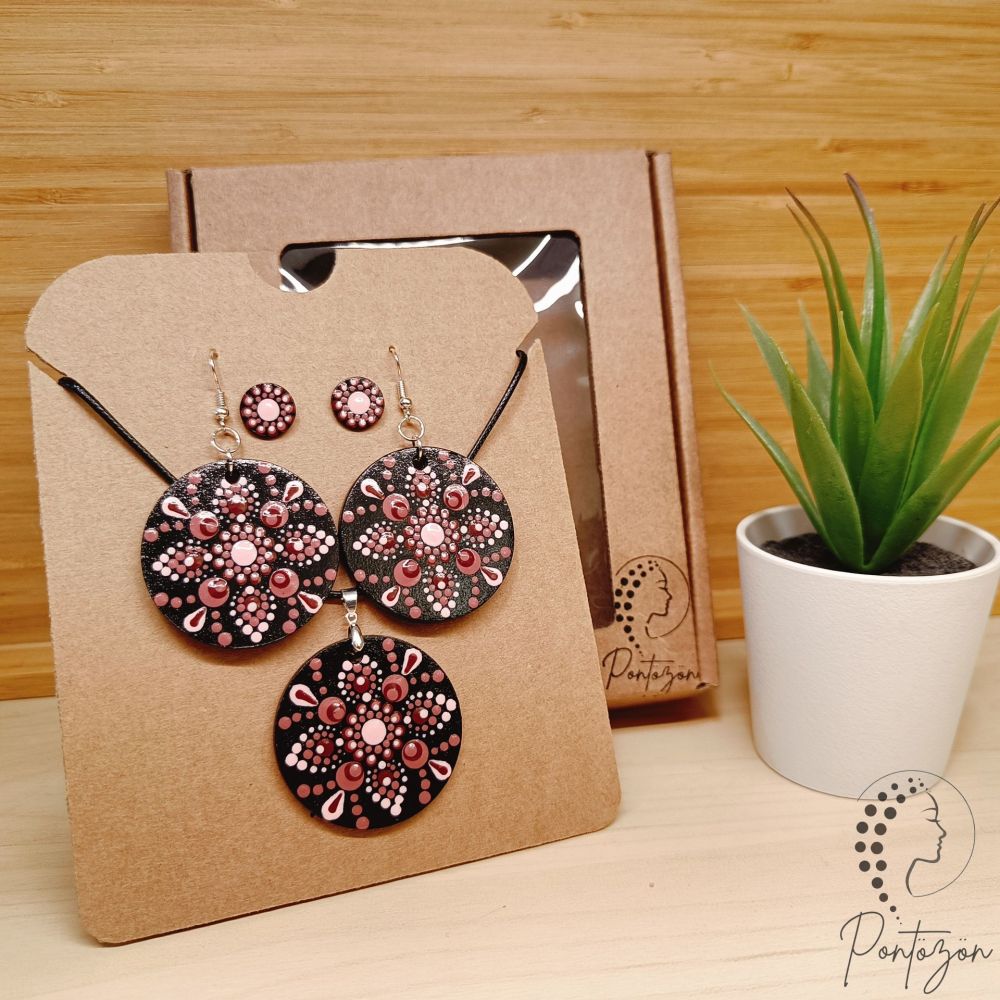 Egyedileg készített egyoldaú fülbevaló, kis méretű fülbevaló és nyaklánc szett bordó és rózsaszín árnyalatokkal.